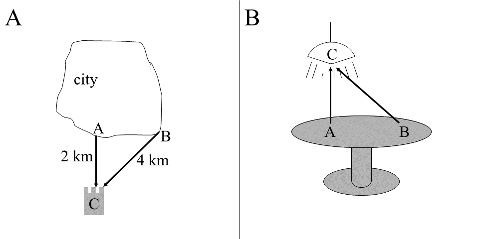 Example (5a) can refer to the situation in Figure 3A if the nominal modifier is twee kilometer but not if it is vier kilometer. Similarly, (5b) can refer to Figure 3B if the adjectival modifier is recht, but not if it is schuin. The contrasts found in (5) would of course be unexpected if the vectors