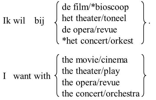It is not surprising that articles can also exhibit deviant semantics in idiomatic expressions. In (175) we give some examples with an indefinite article, and in (176) some examples with a definite article. There is no sense in which the articles in these examples evoke a referential reading; the (in)definite noun phrases are simply part of idiomatic clusters of verb plus (prepositional) object. Some of the nouns also occur as referential nouns in (present-day) Dutch with the meaning given in the glosses; the nouns repeated in small caps in the glosses do not.