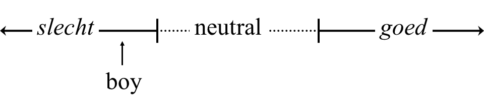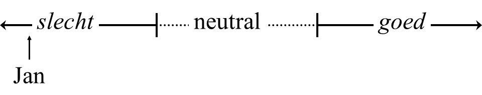 Although these semantic representations are adequate approximations of the meanings of the examples in (3), they do not fully express their meanings. By using (3a), we imply that Jan has a certain place on the implied scale of goodness in (2), as in (4a), while in (3b) we imply that there is at least one boy who has a certain place on the scale, as in (4b); in the case of the plural slechte jongensbad boys, each boy can be in a different place, as long as they are before the neutral zone.