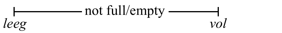 If we want to maintain that the terms scalar and gradable are the same, we have to assume that there are two kinds of comparatives (and superlatives, but we will not discuss that here), just as in the case of the adverbs vrij and zeer. Since we have just seen that we cannot appeal to logical implications to determine whether we are dealing with a gradable adjective or not, we have no choice but to claim that we are dealing with gradable adjectives if the comparison can be expressed by means of a scale. However, this would run into problems with absolute adjectives like leegempty and volfull. As discussed in Section 23.3.2.2, sub I, these adjectives denote the boundaries of the scale in (72), repeated here as (110).