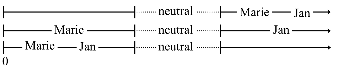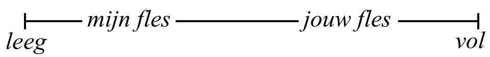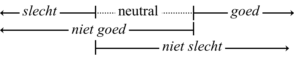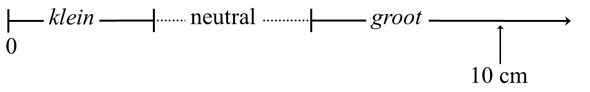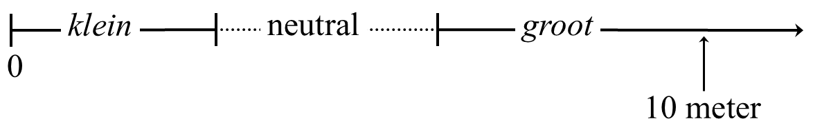 Example (108) with the scalar adjective grootbig implies neither that Jan is tall nor that he is short: as long as Marie is to the left of Jan on the scale of size, the statement in (108a) is true. In other words, (108a) is true for all the situations given in (109).