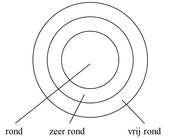In this respect, the adverbs vrij and zeer in (106b) behave like the approximatives discussed in Section 23.3.2.2, sub II; they simply indicate that the shape of Jan’s face resembles a round shape. The adverb vrij indicates that Jan’s face vaguely resembles a round shape, and zeer indicates that it is close to being round. In other words, there is no scale of roundness implied, but we are dealing with several sets that properly include each other, as in Figure (107); to avoid confusion, note that the circles represent sets, as usual, and have nothing to do with the geometric shape denoted by the adjective rond.