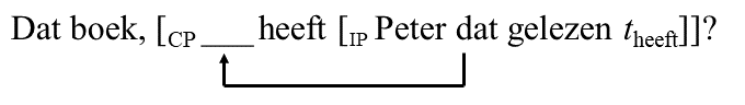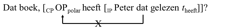The evaluation of this argument is complicated by the fact, indicated by the number sign, that examples such as (58b') are acceptable when pronounced with the intonation contour typical of polar V2-clauses such as (56c), which is somewhat easier to obtain if we add the modal particle toch; Dat boek, dat heeft Peter toch gelezen? This means that we have to assume the two structures in (59): the polar V1-construction in (59a) does not allow movement of the resumptive pronoun into the clause-initial position, since this position is already occupied by the phonetically empty polar operator; the polar V2-construction in (59b) does allow movement.