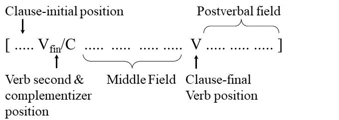 With the help of the two verb positions introduced above, we can define three topological fields, as indicated in (3). The clause-initial position can contain at most one constituent, which usually has a specific information-structural function: it can be a question word, a discourse topic, a contrastively focused element, etc. The middle field can contain constituents of various types, such as nominal and prepositional arguments, complementives, and adverbial phrases. The same is true for the postverbal field, which usually contains longer constituents (especially in the form of a PP or a clause), such as complement clauses, relative clauses, and adverbial phrases/clauses.
