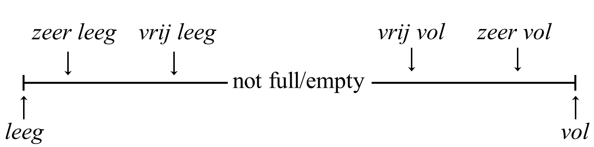 Note that goedgood, which was given above as a scalar adjective, can also be used as an absolute adjective, in which case it means “correct” and stands in opposition to the adjective foutwrong. Example (276) is therefore not a counterexample to the claim that approximatives cannot be combined with scalar adjectives, because here goed can only be interpreted as “correct”.