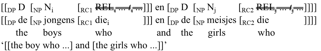 The fact that (453b) is still reasonably acceptable may follow from the fact that backward conjunction reduction leads to the acceptable representation in (454a). An argument for such an analysis is that the two conjuncts in examples such as (453b) must be of the same gender; the (b)-examples (454) show that if the conjuncts are of different genders, the first relative pronoun cannot be deleted by conjunction reduction, but must be realized overtly. Example (454b') may be slightly marked, but improves if the verbs are replaced by verbs in the present tense, which would allow generic reading: Elke jongen die en elk meisje dat te laat komt, wordt gestraftany boy or girl who is late will be punished.