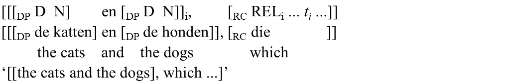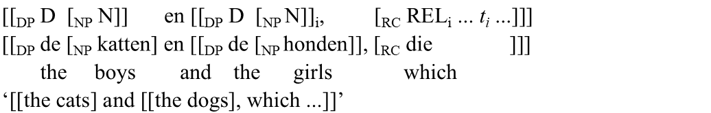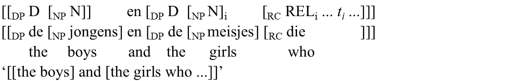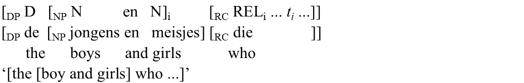 | b'. | Een man | en | [de jongen, | die | te laat | kwam], | werden niet toegelaten. | |