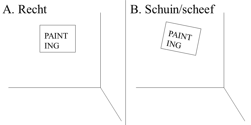 | b'. | Hoe | steekt | de spijker | uit de muur, | schuin of recht? | |