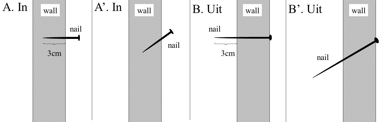 The meaning expressed by the putative modifiers in (53) is of a completely different nature than that of PPs denoting a set of vectors. This is most obvious in the case of the putative modifiers of distance. In the case of PPs denoting a set of vectors, these modifiers indicate the distance between the reference object and the located object. In the case of in/uit, on the other hand, the modifier indicates how deep/far the located object penetrates/protrudes from the wall; this is shown in Figure 6A&B. Similarly, in the primed examples, schuin indicates the way (i.e. direction) in which the nail penetrates or protrudes from the wall; this is shown in Figure 6A'&B'.