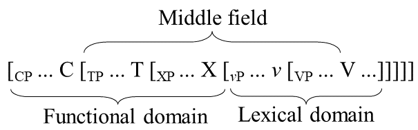 Section 11.3 has discussed various types of A'-movement involved in the formation of wh-questions, relative clauses, °topicalization constructions, etc. These so-called wh-movements differ from the A'-movements to be discussed in this section in their choice of landing site: whereas wh-movement targets the clause-initial position (the specifier of CP), the movements in this section target some position in the middle field of the clause. It is often assumed that the positions targeted by A'-scrambling are the specifier positions of various functional projections in the functional domain of the clause, indicated by XP in structure (80).