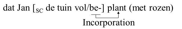 The incorporation analysis can immediately account for the complementarity in the distribution of be- and the adjectival complementive volfull in example (492c), by appealing to the more general restriction that a clause can contain at most one complementive. Further examples showing that verbs prefixed by be-, ver-, and ont- cannot be combined with a complementive are given in (499); cf. Section 2.2.1, sub IV, for discussion.