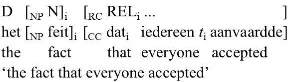 Finally, note that the infinitival clause in (686a) can also be interpreted as a purpose clause. This is related to the fact that the om-clause in (687) can also be interpreted either as the complement of the noun or as an adverbial phrase indicating purpose. The fact that om-clauses in sentence-final position are typically interpreted as purpose clauses may well affect the judgments on (686). This concludes our discussion of complementation of nouns.
