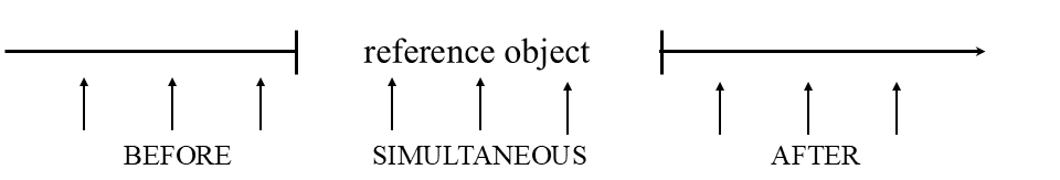 Section 32.3.2, sub IB, has shown that the vector approach to spatial adpositional phrases can also be applied successfully to temporal adpositional phrases. Since the timeline is only one-dimensional, an exhaustive description of the temporal relation requires only the three relations before, simultaneous and after, as in (85).