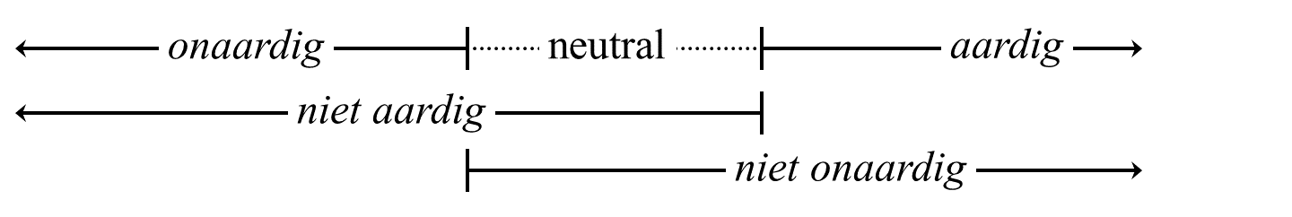 Negation can also be expressed by quasi-negative phrases, in which the negation is in some sense hidden in the meaning of the phrase: weiniglittle in (313a), for example, can be paraphrased with an overt negative as niet veelnot much. Other quasi-negative modifiers are given in (313b&c); in all these cases, the use of the modifier suggests that the property denoted by the adjective does not apply. The dollar sign assigned to (313c), in which niets alternates with the more colloquial form niks, indicates that such examples are old-fashioned and not accepted by all speakers; some other examples are Zij/Dat is niets aardigShe is not at all kind /That is not at all nice, Zij is niets lui; ze werkt hardShe is not lazy, but works hard and Zij is niets bang; ze durft allesShe is not afraid, but dares everything.