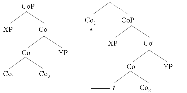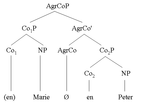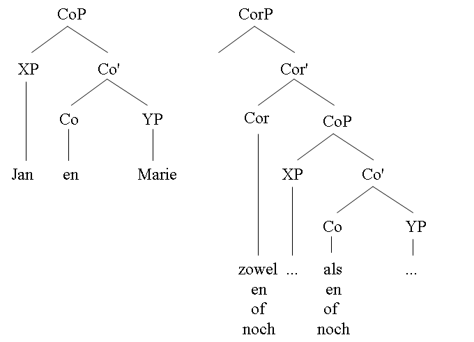 | c. | [[CP Jan zal [FocusP en [Foc Ø] [VP schuld bekennen]]] en [CP hij zal vluchten]]. |
