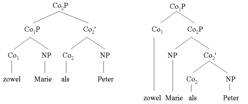 Another thing that needs to be mentioned is that it is no longer clear a priori that the figures in Table 21, repeated from the introduction to this section on correlative coordinate structures, can still be used for arguing that correlative structures are not part of the core syntax. We claimed in the introduction to this section that this was the case because even the frequency of zowel ... als ...both ... and ... is negligible compared to the frequencies of simplex enand (14592/3650), ofor (1686/452), and maarbut (3224/1437) in the same corpus. However, now that we have seen that the initial parts of these sequences are focus particles, we may have made the wrong comparsion. On the assumption that Uit den Boogaart (1975) has listed the focus particle alleen as an adverbial (code 500), his corpus has up to 739 occurrences in writing and 210 occurrences in speech, which may lead to the conclusion that correlative constructions of the kind discussed here are part of core syntax after all.