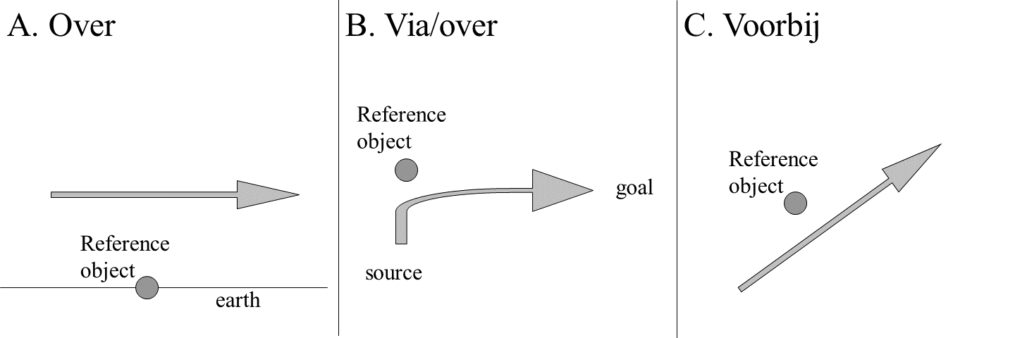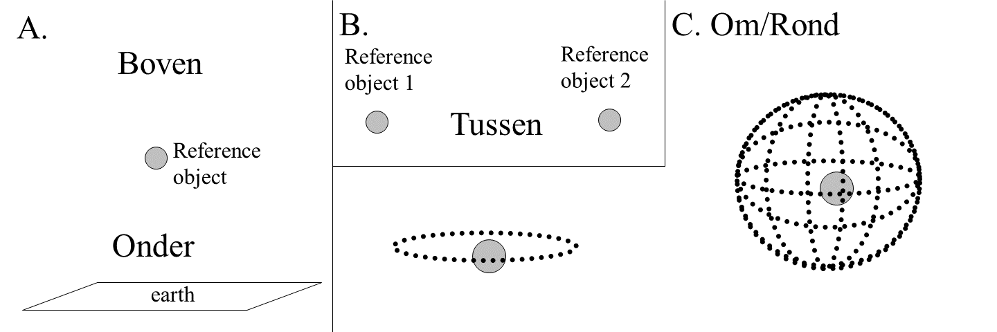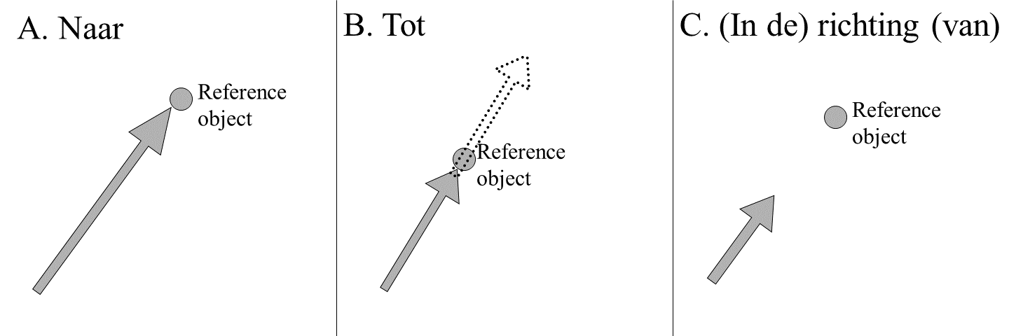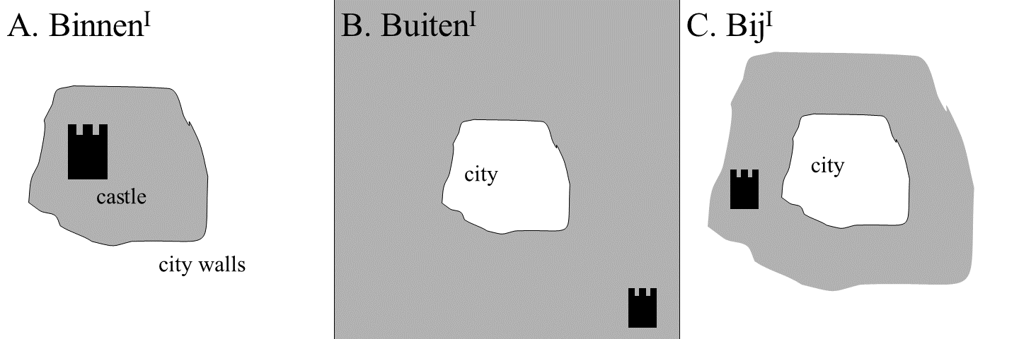 The previous subsections discussed three main classes of spatial prepositions: deictic, absolute and inherent prepositions. Our results are summarized in Table 17 below. The class of deictic prepositions is rather small and can also be used inherently; they are strictly locational, i.e. they cannot be directional. The class of absolute prepositions can be divided into two subclasses: the first is locational (and possibly also directional) in nature, while the second is strictly directional. The inherent prepositions can also be divided into two main groups: those that denote a set of vectors (type I) and those that denote the null vector (type II). Type I can be further divided into prepositions that are similar to deictic prepositions in that they refer to the dimensions mentally attributed to the reference object (type Ia), and prepositions referring to the physical dimensions of the reference object (type Ib). Type II can be further subdivided into prepositions that require the located object to be inside the reference object (type IIa) and prepositions that require only some contact between the located object and the reference object (type IIb). We added the formal preposition te (not discussed above) because it is only used in locational constructions such as Jan woont te AmsterdamJan lives in Amsterdam, whereas all other locational prepositions can be used in constructions involving a location or a change of location. Finally, it can be observed that the prepositions can be divided into two main groups, depending on whether the preposition involves the orientation/direction of the vectors it denotes, or their magnitude, i.e. the distance between the located and the reference object. The first group includes all deictic and directional prepositions; the second group, for obvious reasons, includes all prepositions denoting the null vector.