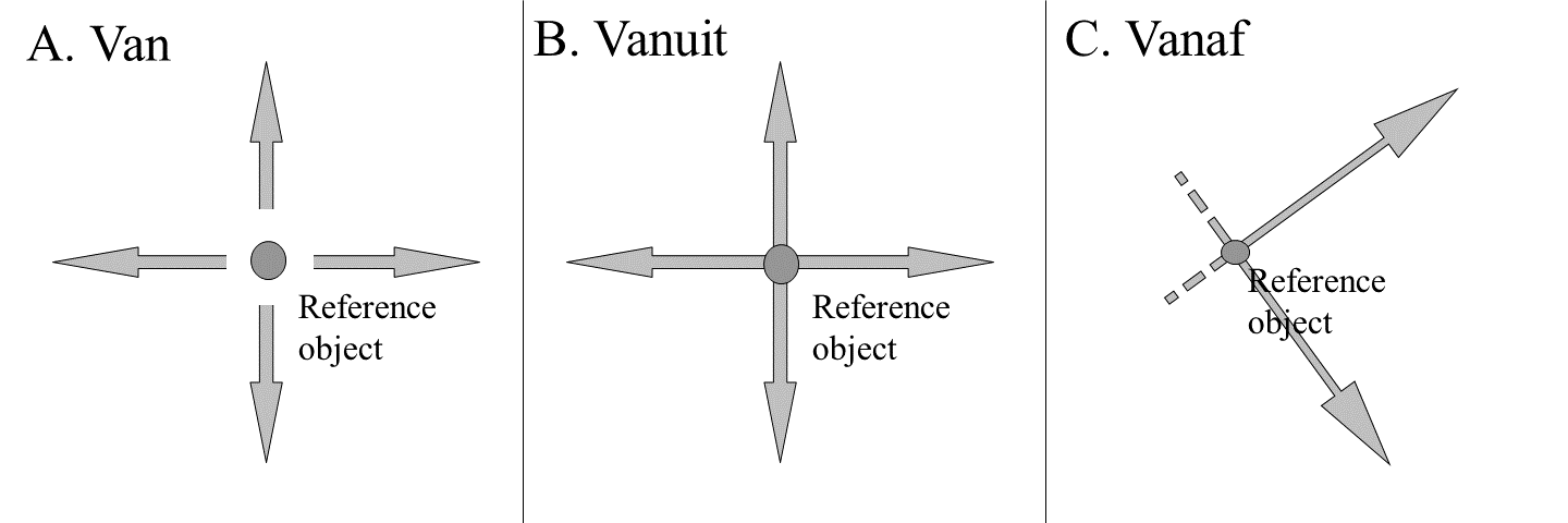 | type | preposition | deictic | inherent | absolute | locational | directional | vector | ||