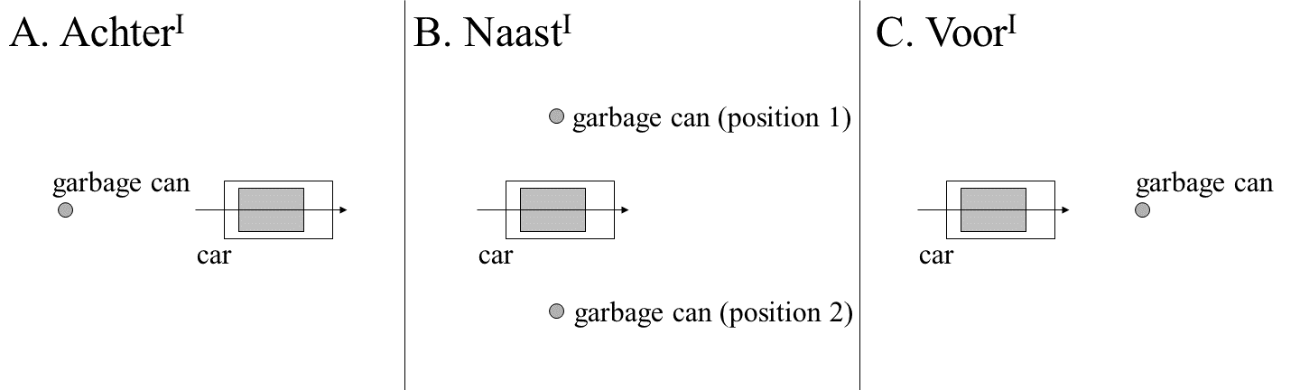| achter, naast, voor | — | — | + | + | — | — | + | — | |