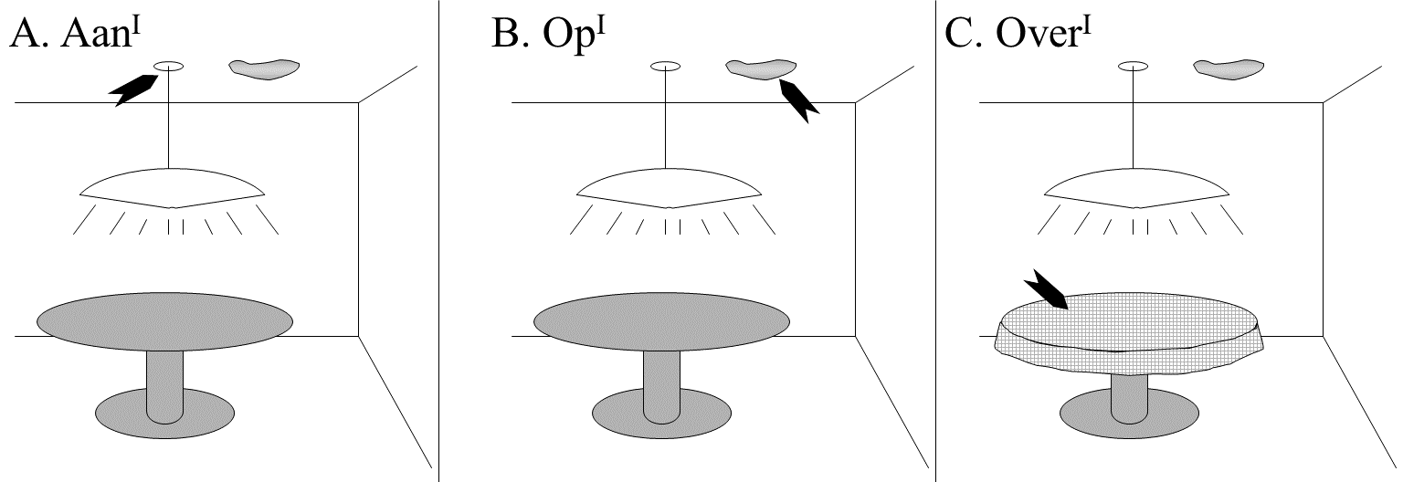 The four prepositions differ with respect to the kind of contact they imply. The preposition aan is compatible with minimal contact: the lamp in (245a) is connected to the ceiling only by its wire. The preposition op suggests more extended contact between the located object and the reference object; the stain in (245b), of course, has maximum contact with the ceiling. The preposition over also suggests more extended contact, but now it is the reference object that has more extended contact with the located object.