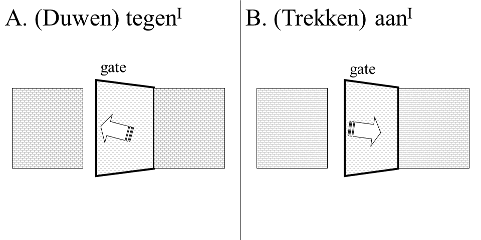 If the notion of exerting force is indeed appropriate in characterizing the preposition tegen, it may be the case that tegen and aan act as antonyms with respect to the direction of the exerted force (at least in some cases). The examples in (252) may make this clear. The verbs duwento push and trekkento pull both express that a force is exerted on the complement of the (non-spatial) prepositional complement of the verb: in the first case the force is directed towards it, and only the preposition tegen can be used, but in the second case the direction of the force is reversed, and only the preposition aan is possible. This is illustrated in Figure 29, where the arrow indicates the direction of the force exerted by Jan.